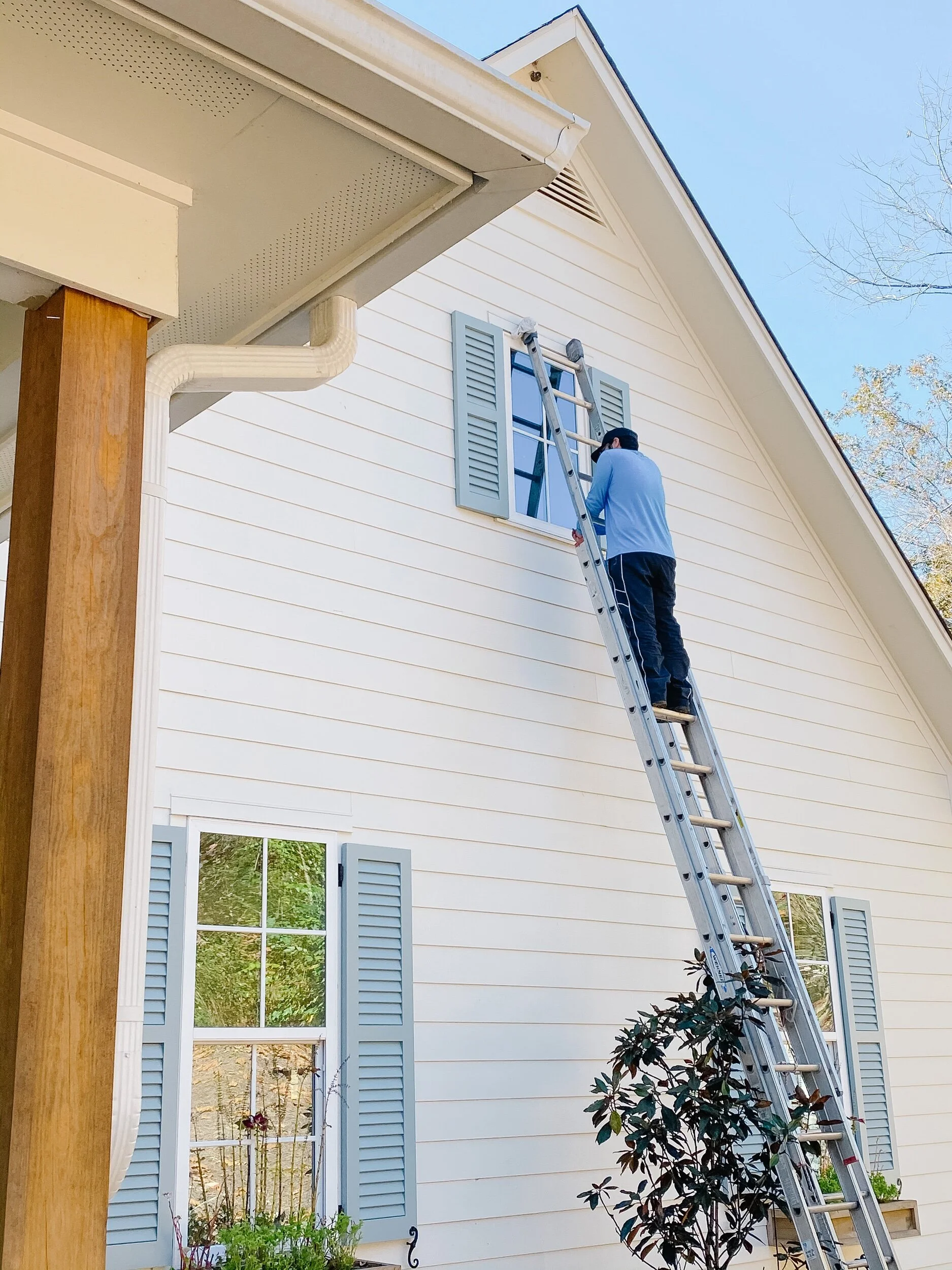 So here we are Hanging shutters on second story windows.